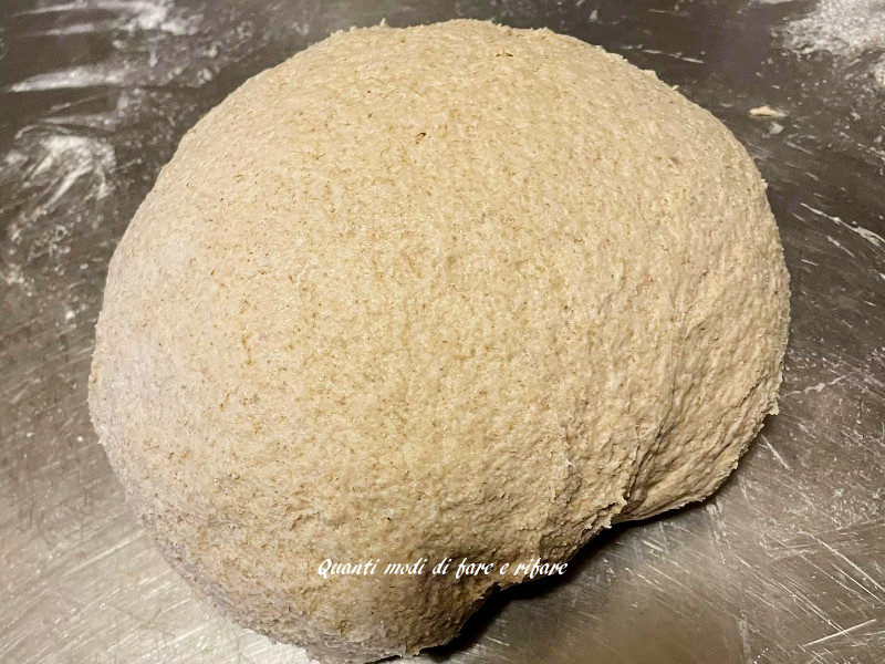 Quando tutto è amalgamato, mettere sul piano lavoro ed impastare ancora un poco, quindi formare una palla e mettere in un contenitore oliato.